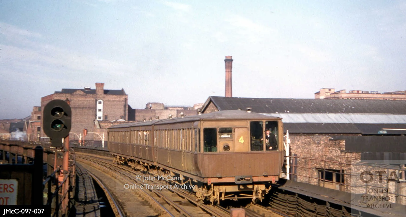 Liverpool Overhead Railway unit 4-47-17 approaches Liverpool city centre with a train for Dingle in late summer 1956, a few months before the LOR closed for good. Photo by John McCann