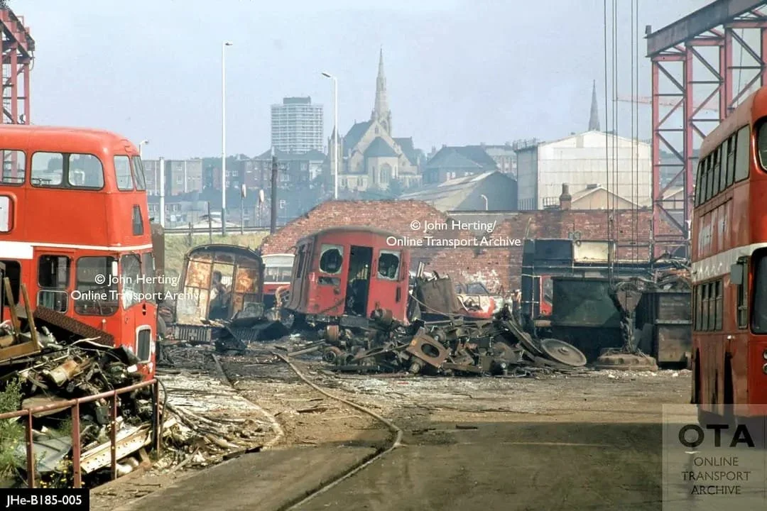 A view of C F Booth of Rotherham taken in circa 1980 with a typical mix of rail and road equipment. Central to this shot is an ex-LT CO/CP-stock driving coach, probably having served time in departmental use. Flanking the frame are former Ribble double-deckers: an MCW-bodied Leyland PD3/5 (left) and an Alexander-bodied Atlantean (right). Photo by John Herting