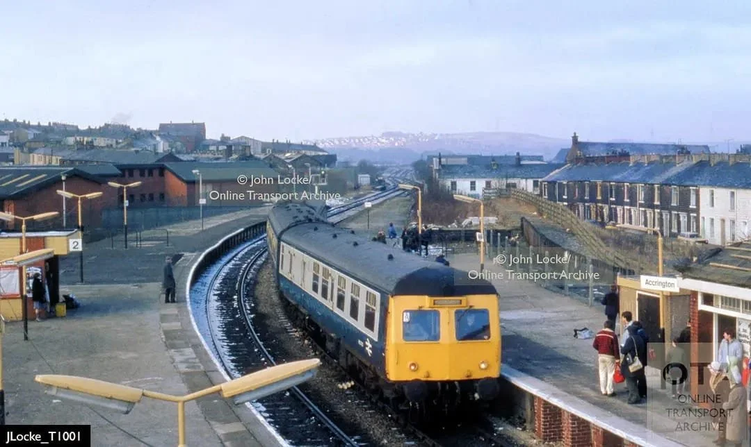 A Class 120 Swindon-built DMU at Accrington Station in February 1985, with a train heading in the Burnley direction. Photo by John Locke