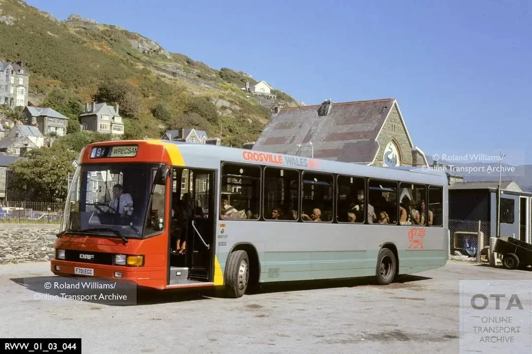 Crossville Wales Optare Delta, DAF SB220, SDD701 (F701ECC) is seen in Barmouth ready to depart on service 94 to Wrecsam. This route was effectively the replacement for the Ruabon-Barmouth railway line which closed in January 1965. The red front on the bus was a short-lived requirement for buses operated under contract to Gwynedd County Council. Photo by Roland Williams